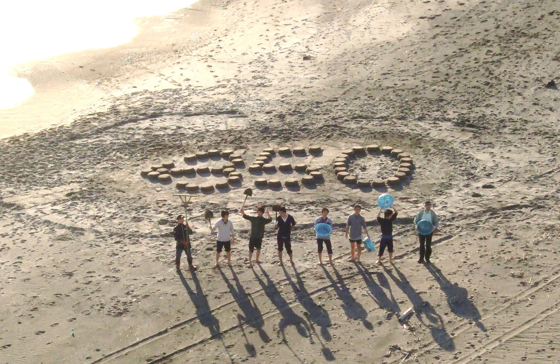On October 24, 2009, 350.org’s “Global Day of Climate Action” consisted of 5,245 separate, yet related, performance works involving 180 countries around the world. All performances included the numbers “350” (most, in 350’s distinctive logo) and, with a scant few exceptions, all took place on the same day. Some performances were very simple, such as people displaying the “350” logo crafted from simple upturned bucketfuls of sand. In this image, the arrow coming out of the three makes the distinctive 350 logo out of the numbers.