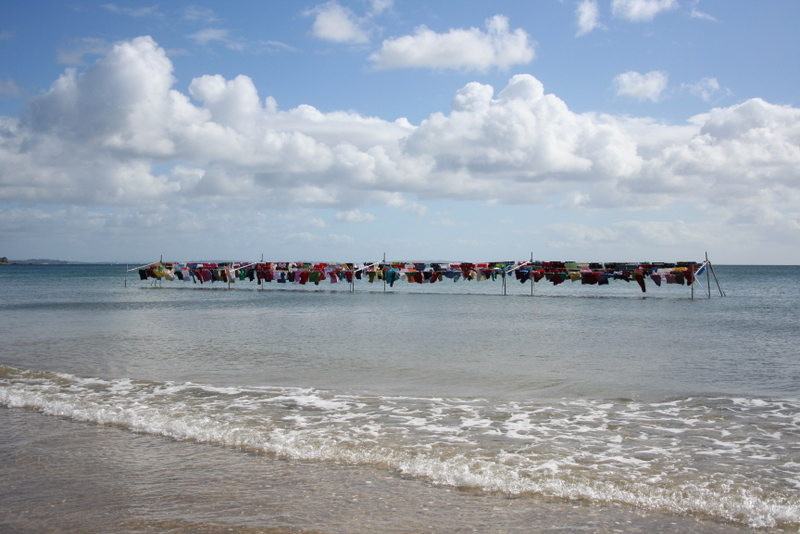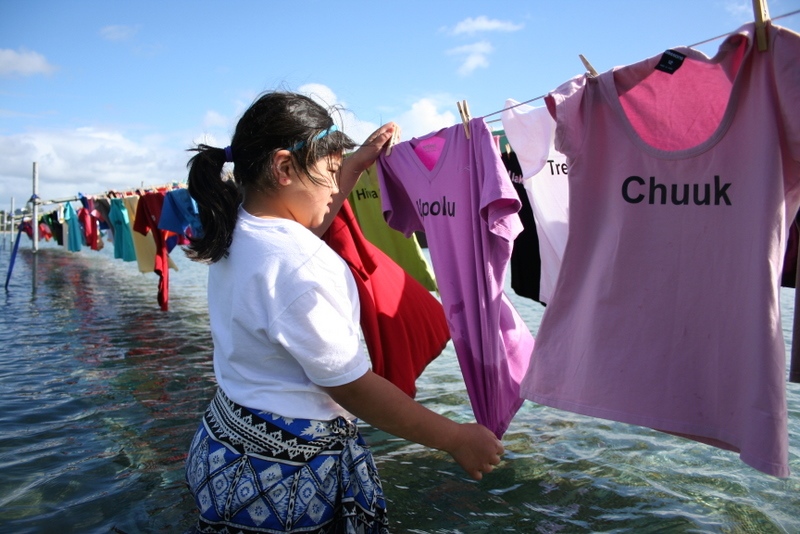 Another particularly evocative piece, created in conjunction with Oxfam, is from the Pacific Islands, and shows clothing hung out, as though to dry, over the ocean. Fluttering in the breeze, multicolored shirts seem fragile and temporary compared to the vast strength of the ocean. This is a performance of implication. Written on the shirts are references to the many hundreds of regional islands susceptible to drowning. The piece implies and embodies the fragility of these islands.