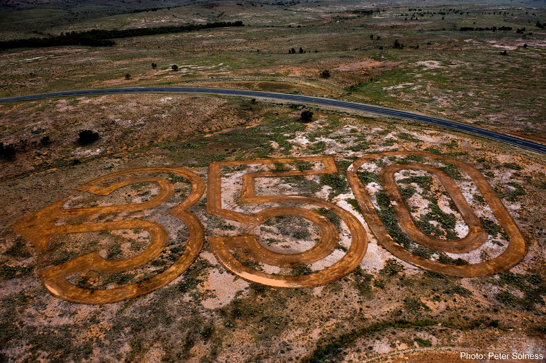 No one needs to be convinced of the artistic value of these projects, initiated by renowned artists or arts institutions. Many are the same kind of line drawings of massive scale as the prehistoric artworks, but they reference their purpose (and the current moment) by using the 350.org logo. Although some, like Fowler’s Gap, Australia, are closer to artworks,
