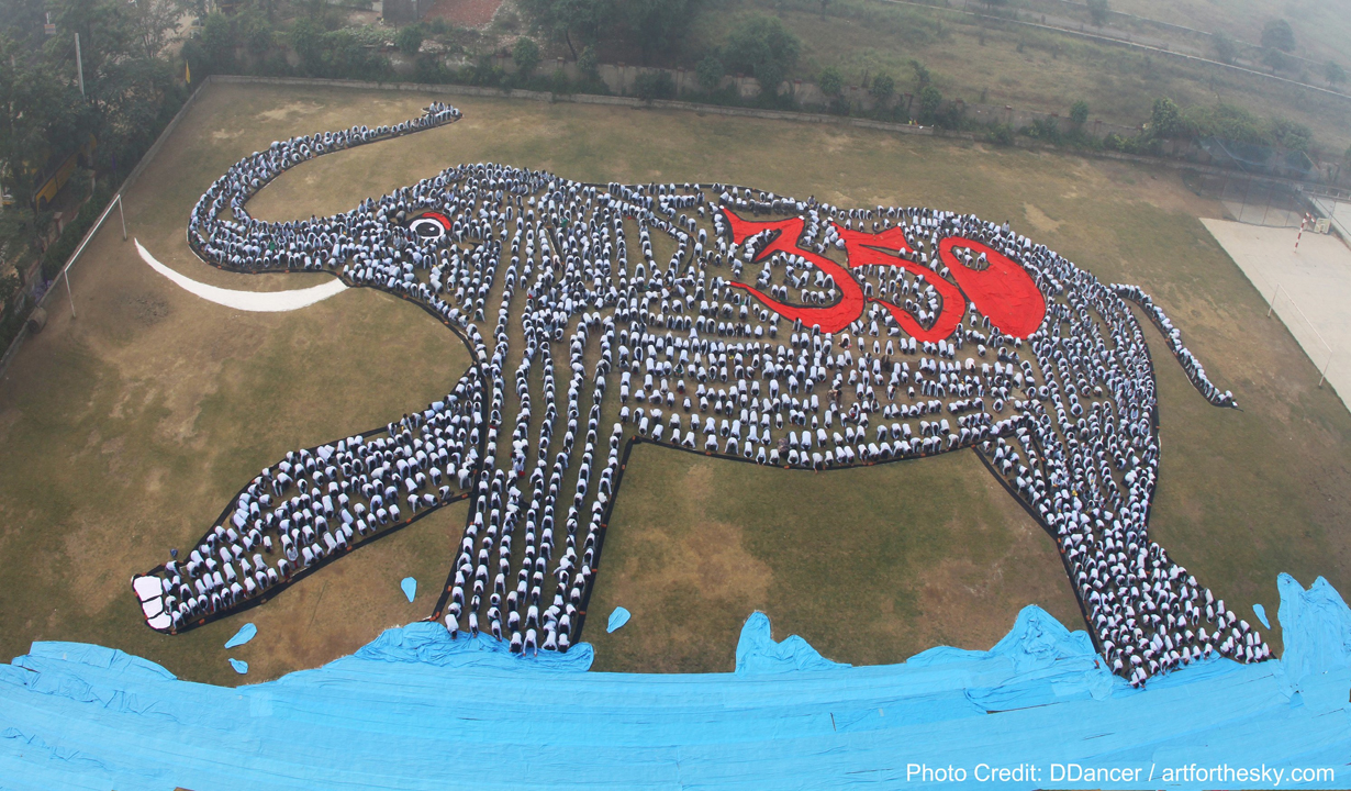 Another interesting example of “eARTh” is the “Climate Elephant” by Daniel Dancer (New Delhi, India). Here, 3,000 young people from the Ryan International School and the Indian Youth Climate Network formed a giant elephant, with the water rising around it. As the performance continues, the water rises up.